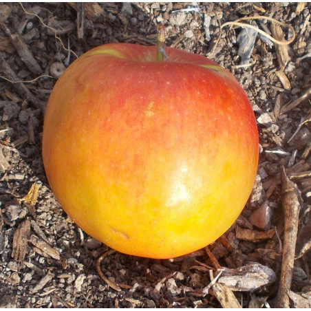 "Fruit moyen, un peu allongé à peau jaune foncé, rouge à l'insolation; chair jaune clair, tendre, douce, sucrée, possédant un arôme particulier qui plait. Arbre très fertile".